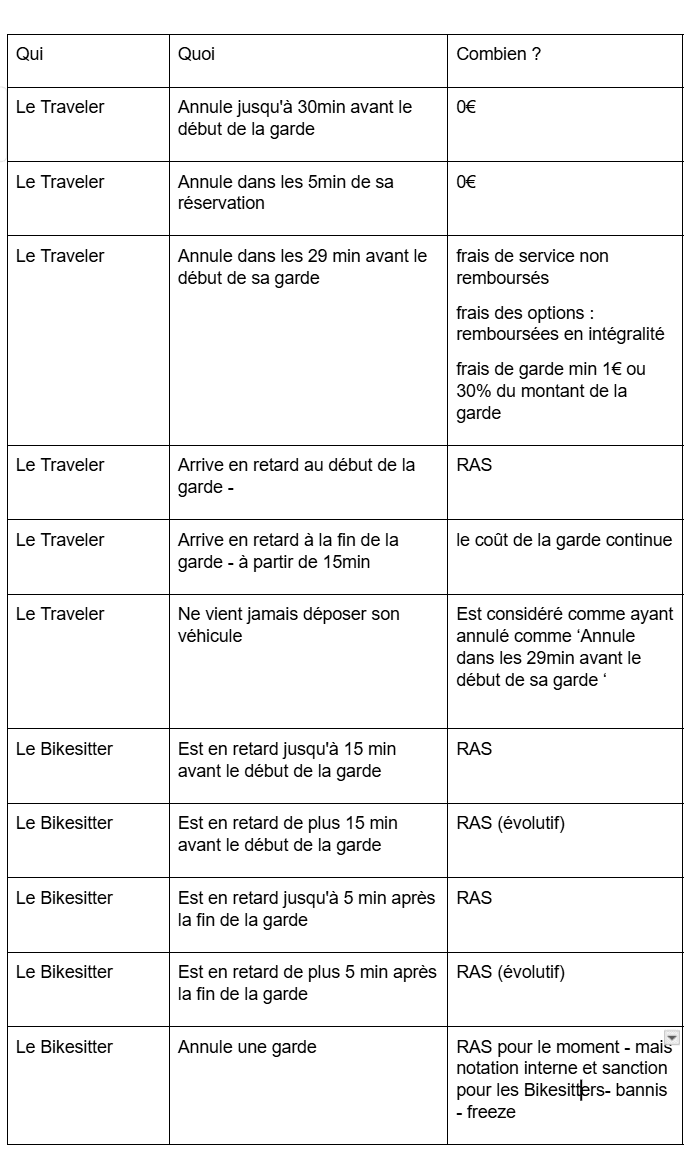 Les frais supplémentaires qui pourraient être facturés aux Travelers en cas de dommages causés par le véhicule dans l'espace de gardiennage ou si les horaires de récupération ne sont pas respectés et seront également crédités au Bikesitter dans les mêmes conditions.